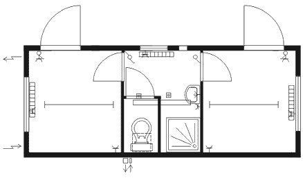 Abmessungen, Aufteilung und die Lage der Ver- und Entsorgungsanschlüsse des Sanitärcontainers "Junior"
